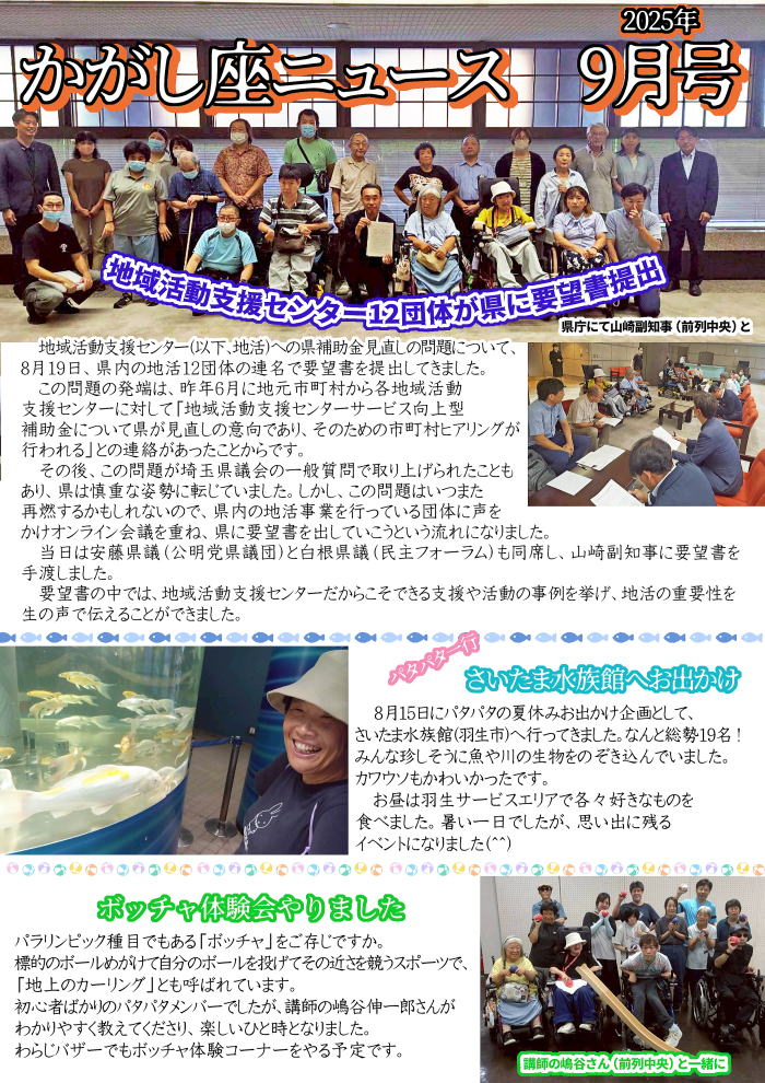NPO法人共に生きる街づくりセンター・かがし座(NPOかがし座)は、「障害もある人もない人も地域で共に」を合言葉に活動している長年活動する「わらじの会」の活動を母体として、2013年に誕生した法人です。